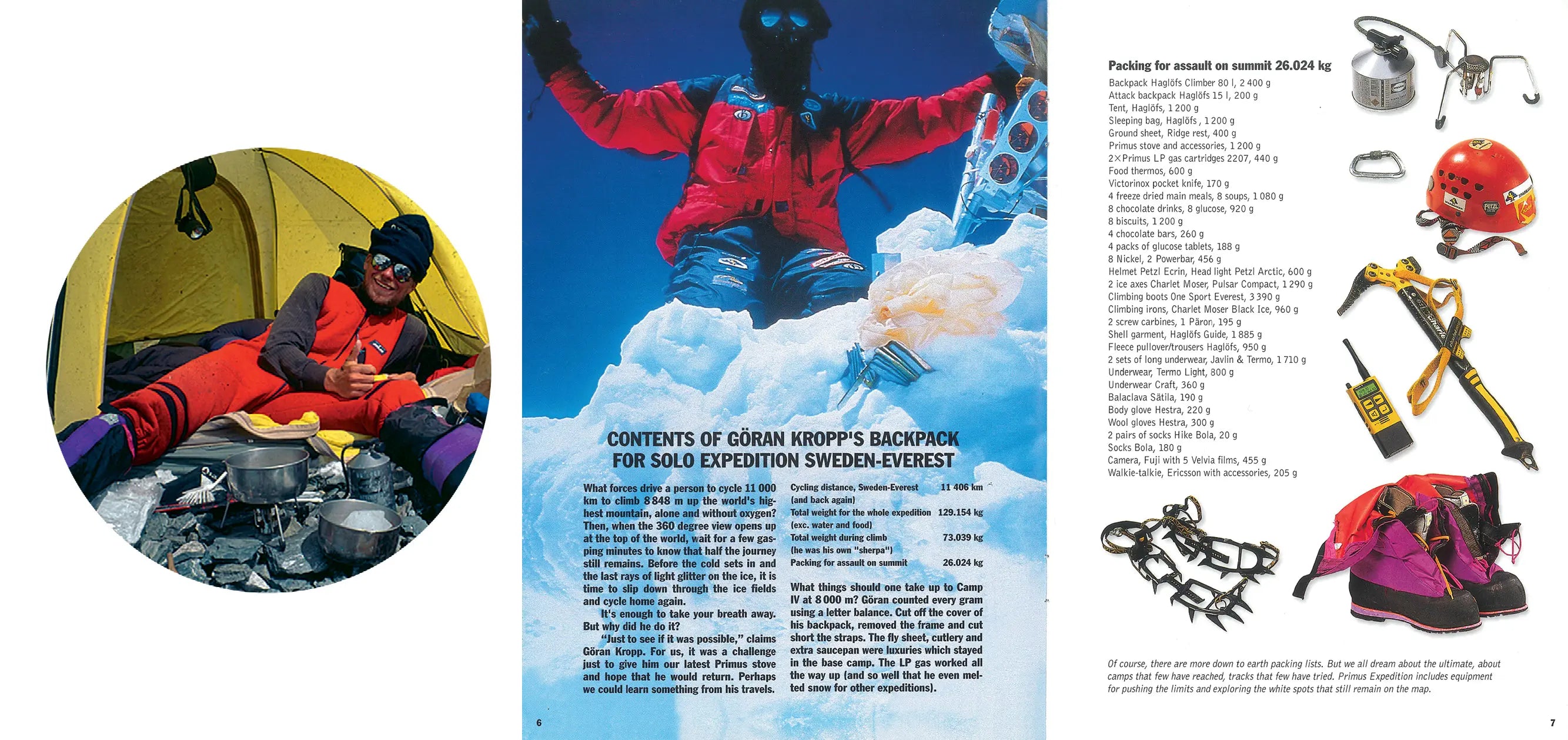 Göran Kropp cyklade från Sverige till Himalaya och blev sedan första skandinav att bestiga Mount Everest utan syrgas. Köket hade fungerat över förväntan och prototypen blev en färdig produkt. Den inspirerade till fortsatt utveckling av vad många betraktar som världens mest avancerade friluftskök –Primus OmniFuel, det enda friluftsköket som kan drivas med både gas, bensin, fotogen och diesel, till och med flygbränsle.