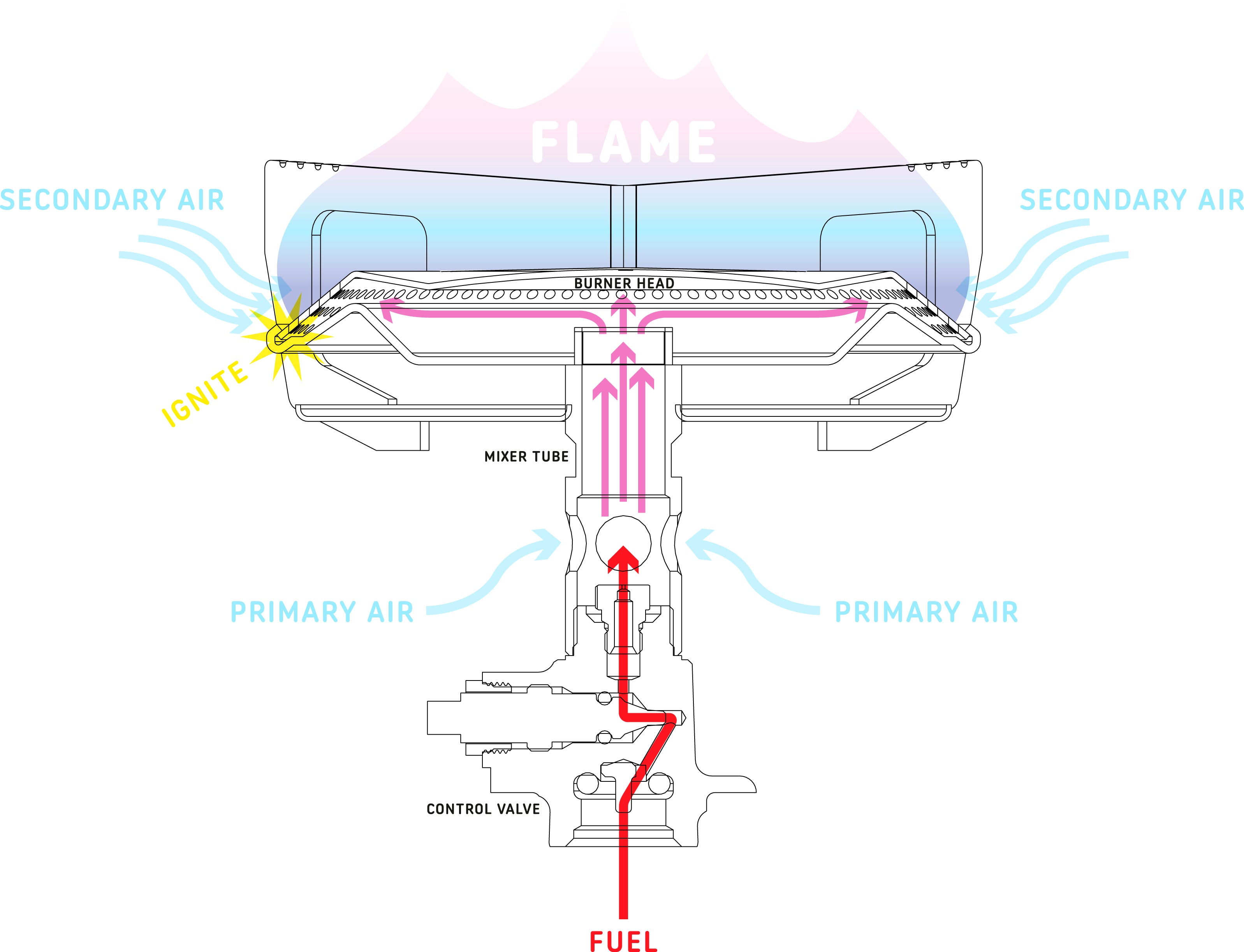 För att en låga ska uppstå behövs tre saker: bränsle, luft och värme. I ett friluftskök passerar bränslet genom ventilen, blandas med luft i mixerröret och antänds i brännarens övre del. Hur denna förbränning kontrolleras – genom brännarens konstruktion och teknik – påverkar värmeeffekt, bränsleeffektivitet, vindtålighet med mera.