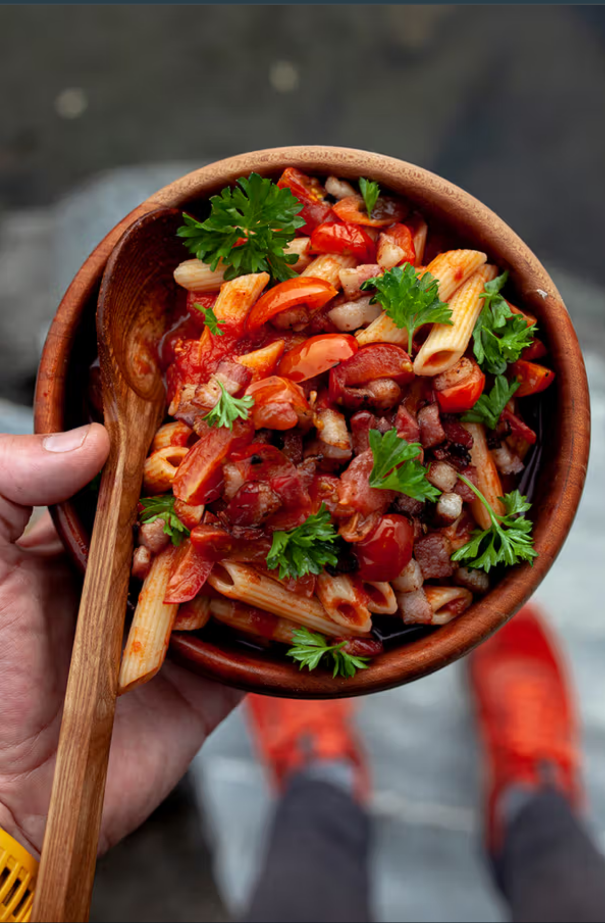 Ett enkelt recept i en gryta, energifyllt och något jag ofta lagar när jag är utomhus. Stek bacon, lök och tomat, tillsätt blandade bönor och krossade tomater, krydda rikligt, och blanda sedan med kokt pasta.