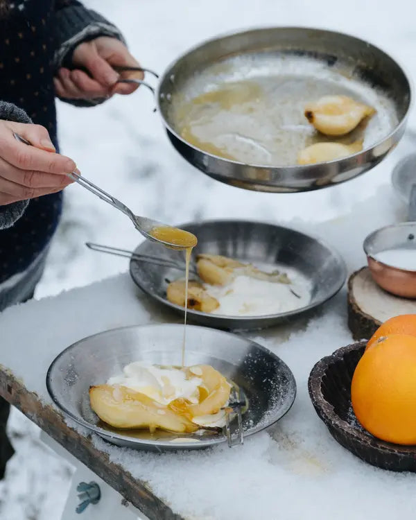 Den perfekta avslutningen på en dag utomhus. Pocherade päron med krämig kola, knaprig mandel och len grädde.