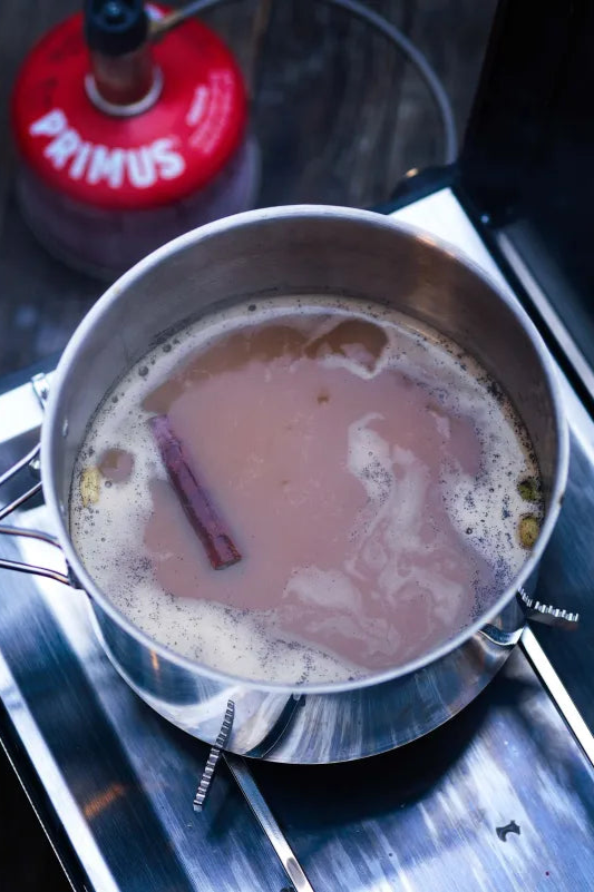 01 Kombinera alla chai-ingredienserna i en 1 liters Primus Campfire-kastrull och värm tills det börjar sjuda.