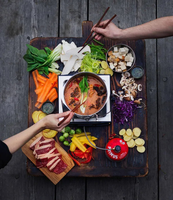Gemeinsam um einen Feuertopf zu sitzen ist beinahe wie ein gemütlicher Abend am Lagerfeuer – nur ohne Lagerfeuer. Die schmackhafte Brühe mit Szechuanpfeffer und getrocknetem Chili wärmt den Körper dabei wunderbar von innen. Ganz egal, wie nass die Socken sein mögen.
