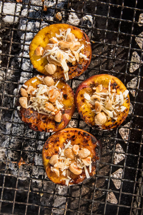 Lege die Nektarinen mit der Fleischseite nach unten auf den Grill, bis die Oberfläche eine schöne Farbe bekommt.