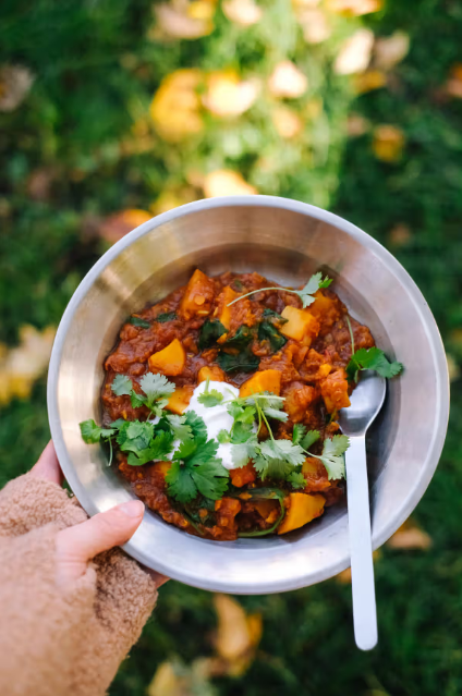 Den Eintopf mit einem Klacks Pflanzenjoghurt und Koriander servieren.