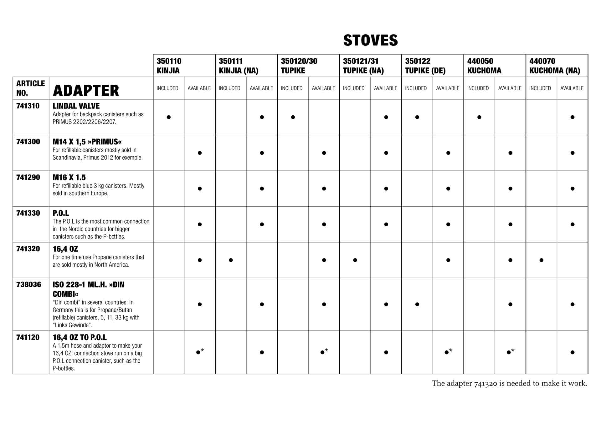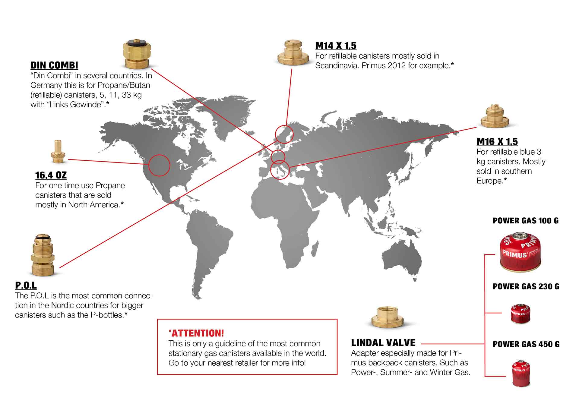 Bei Reisen rund um den Globus ist es wichtig, den richtigen Adapter für deine Gasflasche zu benutzen. Wir möchten, dass du deinen Gaskocher überall benutzen kannst. Im Kaufpreis unseres CampFire Gaskochers ist ein Lindal-Ventil enthalten, das für deine Power-, Sommer- und Winter-Gasflaschen geeignet ist. Für andere Gasflaschen haben wir einige Adapter im Angebot. Diese sind für die meisten erhältlichen Modelle geeignet.