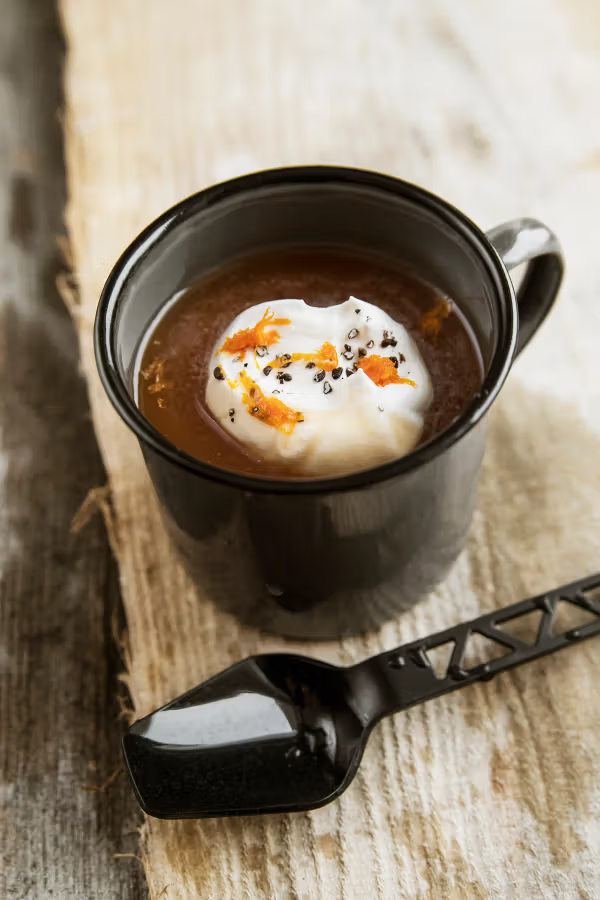 Pour into cups. Top off with a tablespoon of whipping cream, finely grate orange rind over the soup and sprinkle with cardamom.