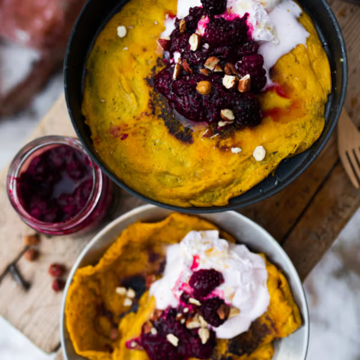 Serve with whipped oat cream, hazelnuts & blackberry jam