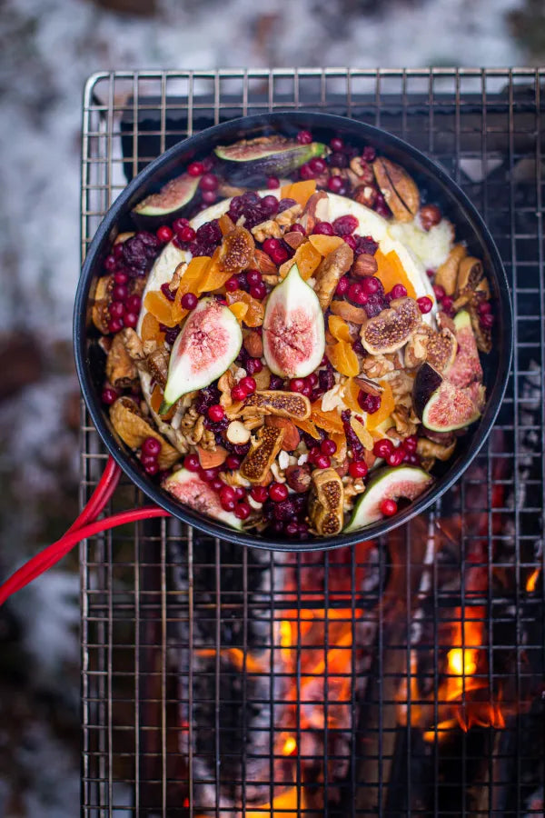 Place the brie in a frying pan and top with fruit, nuts and berries.