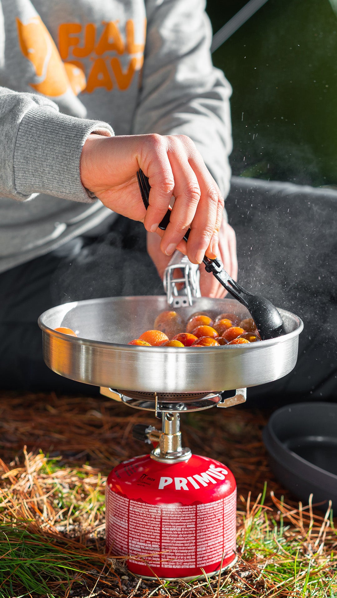 A durable gas stove with duo valve and a wide flame—ideal for cooking with larger pots and frying pans for 1–3 people on outdoor adventures.