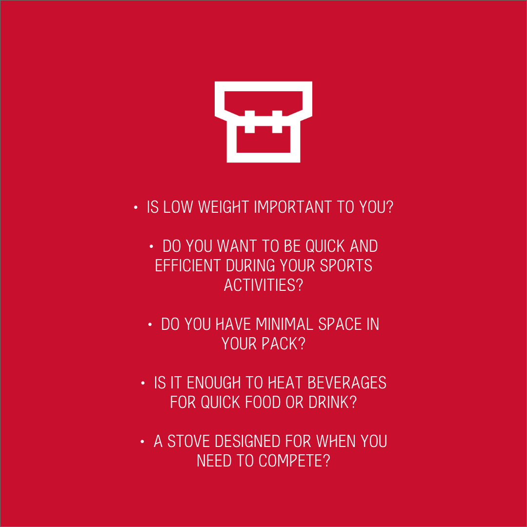 Do you prefer to be as fast and free as the wind? Or at least feel like it. And only need to boil soups or make a quick cup of coffee? Then the obvious choice for you is a stove with minimum weight. But equally important is a clever design that is optimized for taking up minimal space. With hassle-free packing. Is this what you're looking and cooking for? Then our lightweight stoves got your back on the trails, and you won’t even feel it.