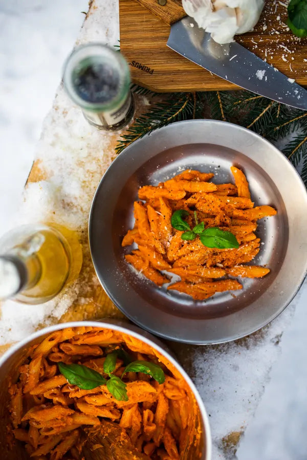 A fantastic, easy-to-make pasta. Don’t be frightened by the vodka – combined with the tomato purée, it provides wonderful warmth, flavor and richness to the dish.