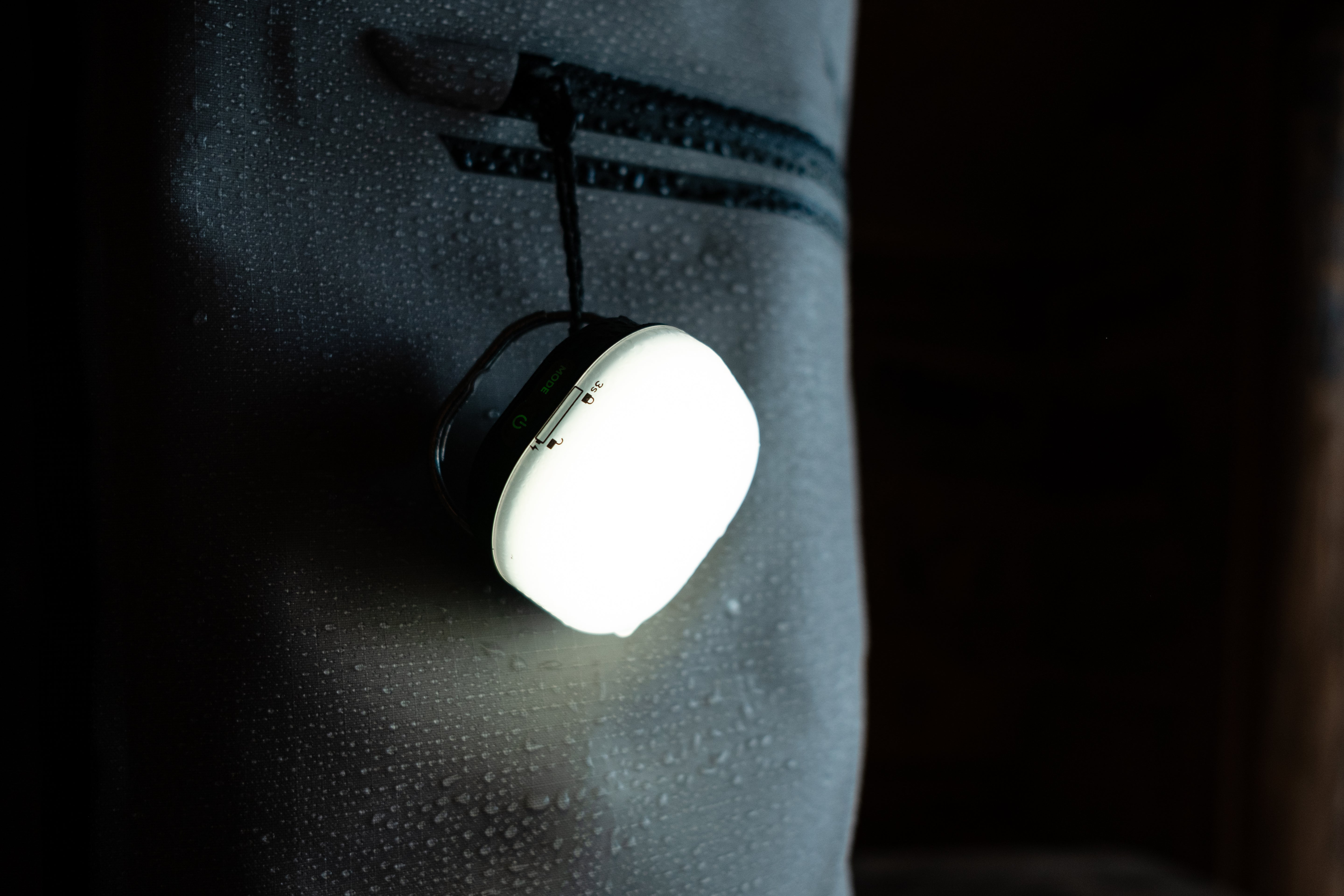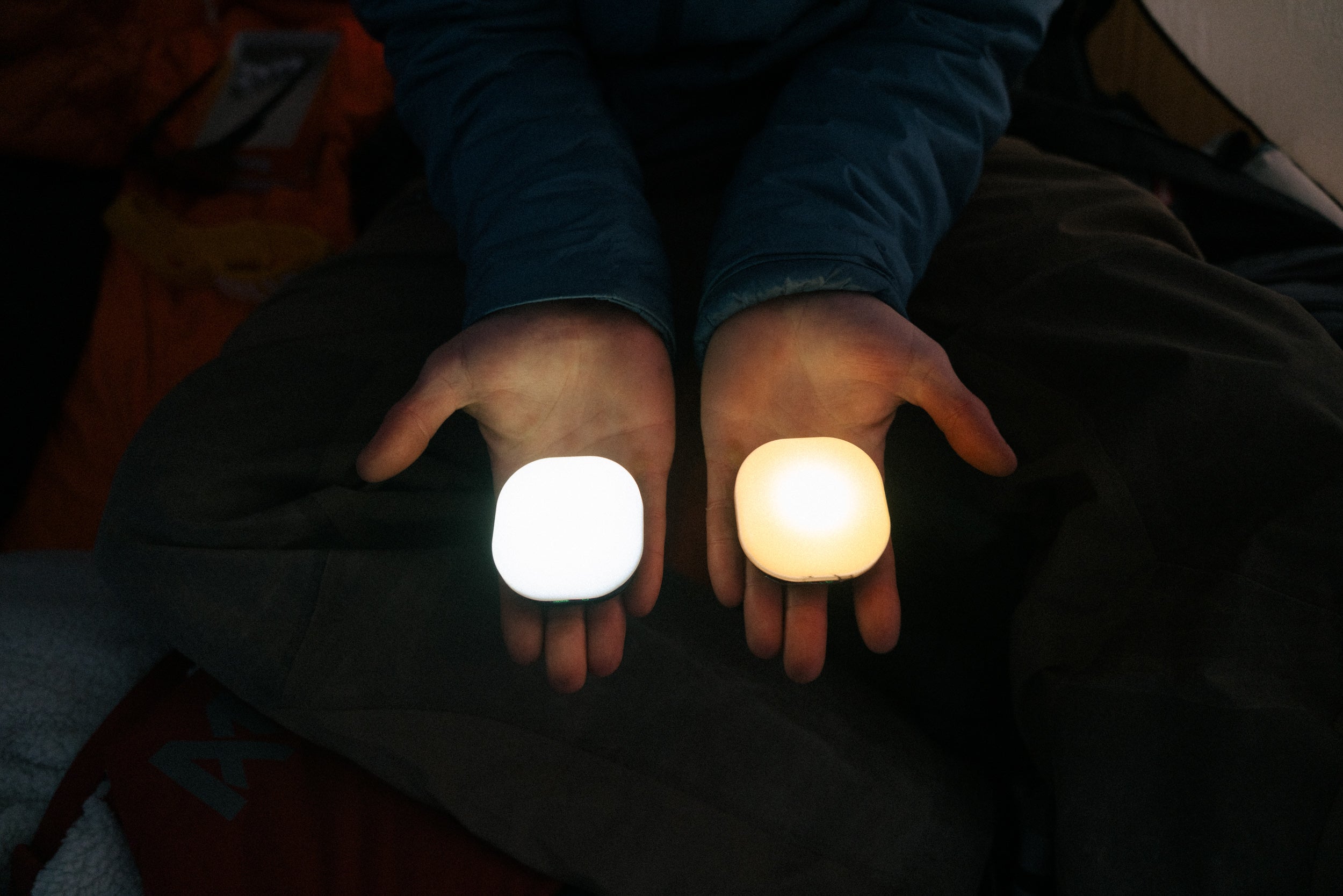 Glow offers two lighting modes: a cool white work light for pitching your tent, cooking, or organizing, and a warm campfire-like glow for relaxing, socializing, or reading. The frosted lampshade diffuses a soft and cozy light, no matter the occasion.