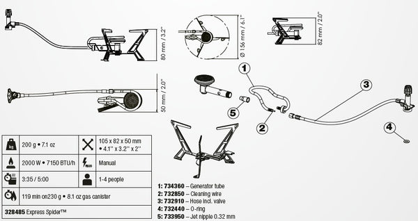 Express Spider är ett superlätt slangmonterat kök med låg tyngdpunkt för extra stabilitet. Dess effekt på 2000W och förvärmningsspole säkerställer pålitlig prestanda, även i kallt väder, och kokar en liter vatten på fem minuter.